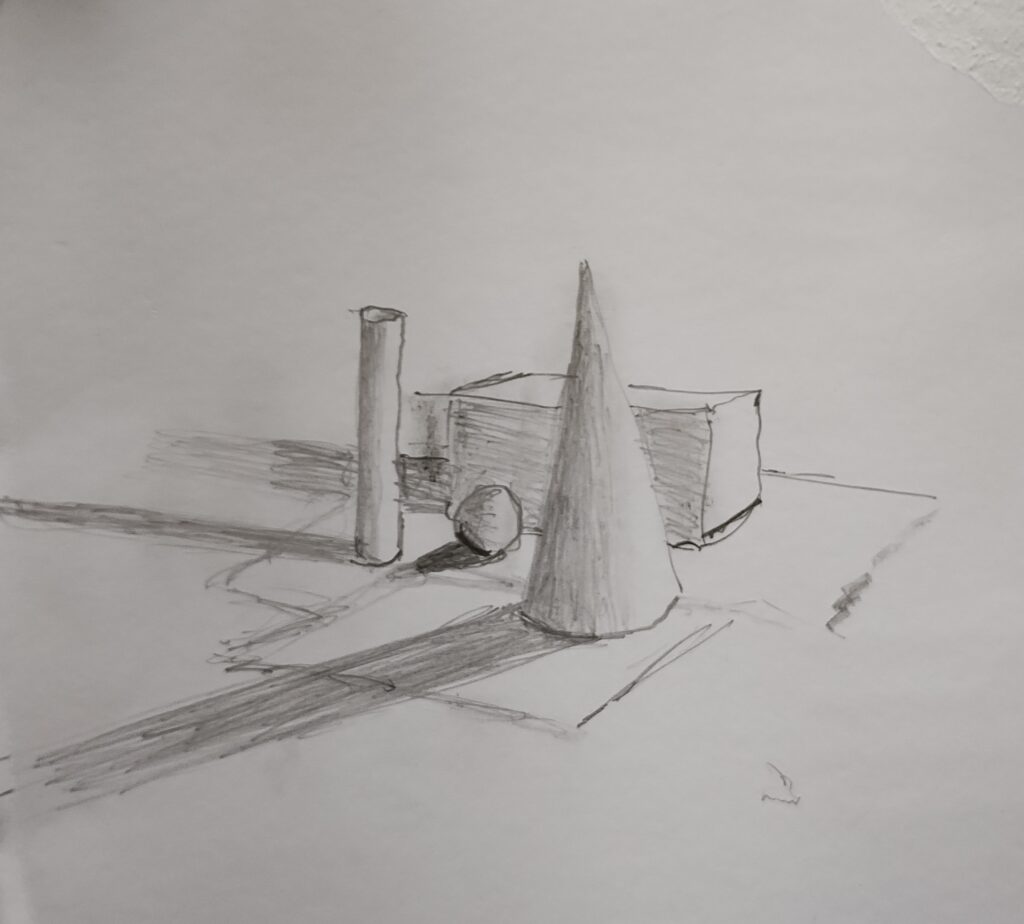 We started out with an arrangement of white cube, sphere, cone and cylinder. Stacy asked us to think how we could start to establish the shape on paper.
