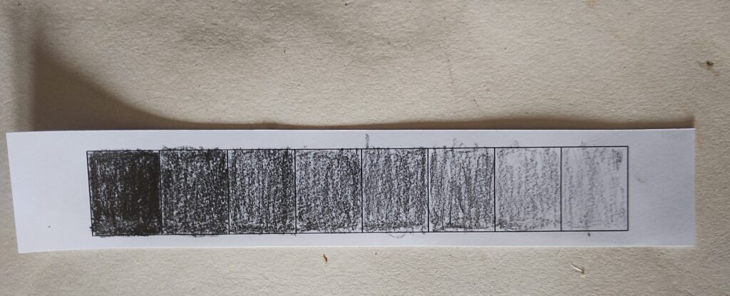 Make sure to leave a good quantity of white paper. On one row at least the dark should be black. The marks should overflow to give colour and texture subtleties. There should be slightly stronger areas of pigment and others could be almost scraped off. Don’t get too fussy.